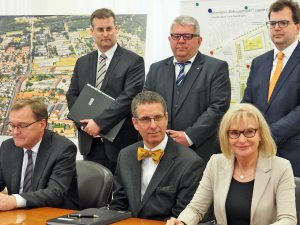 vlnr hinten: Finanzreferent Bertram Felix, Bürgermeister Wolfgang Metzner, Bürgermeister Dr. Christian Lange: vorne:Oberbürgermeister Andreas Starke, Notar Dr. Jens Eue, Monika Maucher, Hauptstellenleiterin der Bundesanstalt für Immobilienaufgaben (BImA).