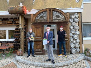 Landrat Johann Kalb übergibt die Urkunde zum Umweltpakt Bayern (v. l.: Oswald Kundmüller, Geschäftsführer Brauerei Kundmüller, Landrat Johann Kalb, Michael Popp, Braumeister Brauerei Kundmüller).
