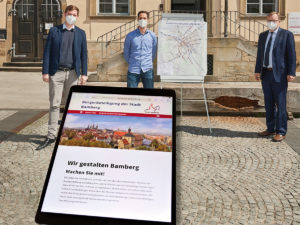 Bürgermeister Jonas Glüsenkamp (v. l.), Amtsleiter Alexander Wagner und Oberbürgermeister Andreas Starke laden alle Bamberger:innen ein, auf www.bamberg-gestalten.de über den Verkehrsentwicklungsplan zu diskutieren.
