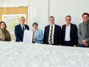 Regierungspräsidentin Heidrun Piwernetz (3.v.l.) überreicht den Förderbescheid an Bambergs Oberbürgermeister Andreas Starke (2.v.l.). Mit ihm freuen sich (v.l) Kulturreferentin Ulrike Siebenhaar, Finanzreferent Bertram Felix, Stadtbau-Geschäftsführer Veit Bergmann und der Leiter Strategische Entwicklung und Konversion, Harald Lang. Im Vordergrund ist das große Stadtmodell zu sehen, das aktuell in der Weißenburgstraße 12 ausgestellt ist.
