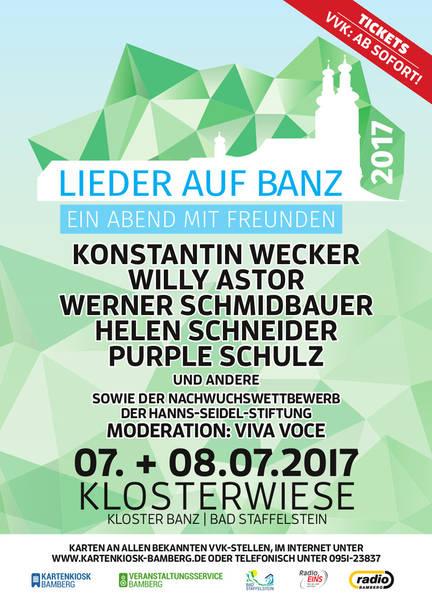 Mit KONSTANTIN WECKER, WILLY ASTOR, WERNER SCHMIDBAUER, PURPLE SCHULZ, HELEN SCHNEIDER und neu als Moderatoren VIVA VOCE steht bereits jetzt eine ganze Anzahl von hochkarätigen Namen für die LIEDER AUF BANZ am 7. und 8.Juli 2017 fest.
