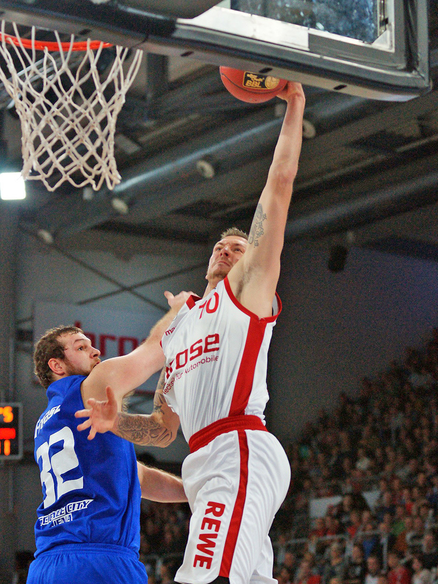 Krachende Bamberger Dunks (hier von Patrick Heckmann) müssen die Jenaer Korbjäger des öfteren über sich ergehen lassen.
