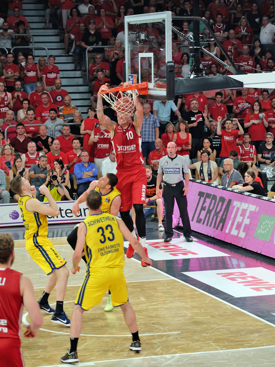 easyCredit BBL - Playoffs 2017, Finale 3: Brose Bamberg vs. EWE Baskets OldenburgAuch nach dem Seitenwechsel konnten die Oberfranken ihre Nervosität nicht vollends ablegen. Auf der Gegenseite kam noch hinzu, dass Oldenburg bis zum Zerreißen um sein Überleben in der Serie kämpfte – jetzt auch mit Unterstützung all der angereisten EWE-Anhänger. Nicht nur anhand des Spielstandes konnte man ablesen, dass diese Partie weiter hin und her wiegte. Die Hausherren profitierten aber auch weiterhin davon, dass man die etwas konstantere Trefferquote an den Tag legte, die Bretter einigermaßen im Griff hatte und auch besser auf den Ball aufpasste.