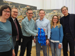 Andreas Irmisch und Christian Hader (Radentscheid) überreichen schon mal die ersten Bänder zum Durchschneiden für anstehende Radinfrastrukturmaßnahmen, natürlich im passenden „Radentscheid“-Blau. Vlnr. Elke Pappenscheller vom ADFC, Oberbürgermeister Andreas Starke, Andreas Irmisch und Christian Hader von der Initiative Radentscheid, Dagmar Spangenberg, Verkehrsplanung Stadtplanungsamt und Baureferent Thomas Beese.