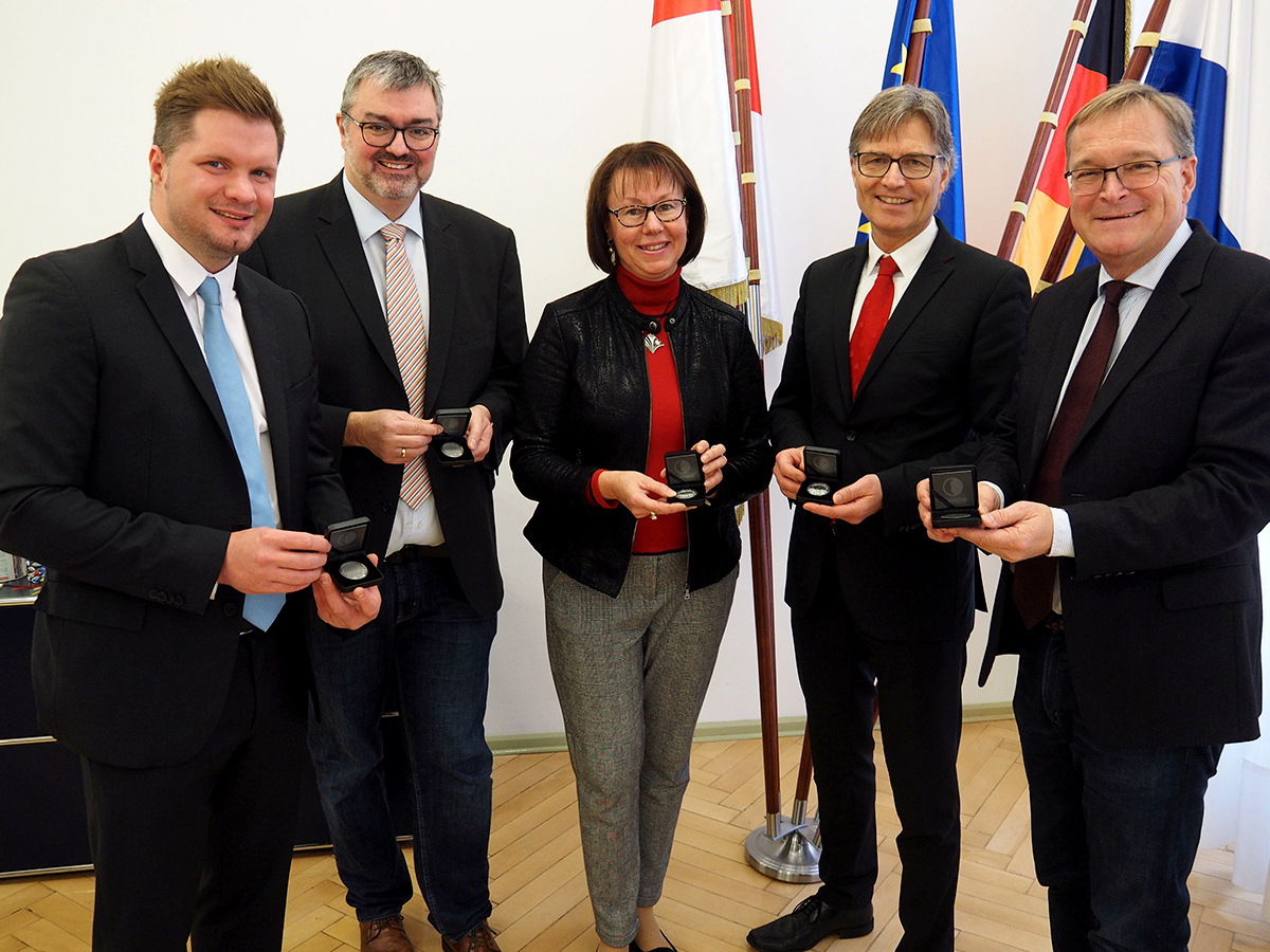 Leif Burghard von EuroMint, Marcus Gessner von den Bamberger Krippenfreunden, Brigitte Riegelbauer vom Bürgermeisteramt der Stadt Bamberg, Mathias Polz von der Sparkasse Bamberg und Oberbürgermeister Andreas Starke (v.l.) präsentieren gemeinsam den Krippentaler 2019.