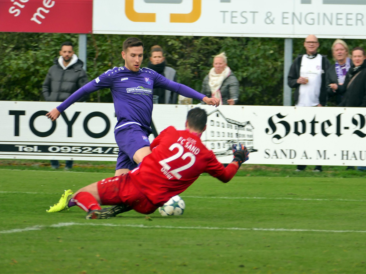 Unbeständig war am späten Samstagnachmittag allenfalls das Wetter über dem Sander Seestadion: Wolken, Sonne und teils heftige Schauer wechselten sich immer wieder ab. Der FC Eintracht sorgte allerdings spätestens nach einer knappen halben Stunde mit seinem überzeugenden Auftritt für stabilen Sonnenschein bei den offiziell 200 Zuschauern, von denen viele aus Bamberg gekommen waren. Wegen der Corona-Auflagen waren nicht mehr Besucher zugelassen worden. In den ersten 30 Minuten dominierten Kampf und Einsatzwillen auf beiden Seiten. Dem FC Sand merkte man an, dass er nicht gewillt war, im Abstiegskampf zu Hause Punkte liegen zu lassen. Die Hutzler-Schützlinge hielten dagegen – und so gab es bereits zwei frühe gelbe Karten gegen Innenverteidiger Felix Popp und Stürmer Tobias Ulbricht. Nach und nach bekam der FCE die Partie aber spielerisch in den Griff und setzte jetzt offensiv deutlich mehr Nadelstiche als in der Anfangsphase. Einer schönen Angriffsaktion folgte der Führungstreffer: Sands Innenverteidiger Maximilian Zang, einst in Diensten des FC Eintracht zu Regionalligazeiten, hielt Tobias Ulbricht im Strafraum fest – Schiedsrichter Andreas Dinger zeigt sofort auf den Punkt. Lukas Schmittschmitt versetzte Sands Torwart Markus Geier und verwandelte souverän ins linke untere Eck.