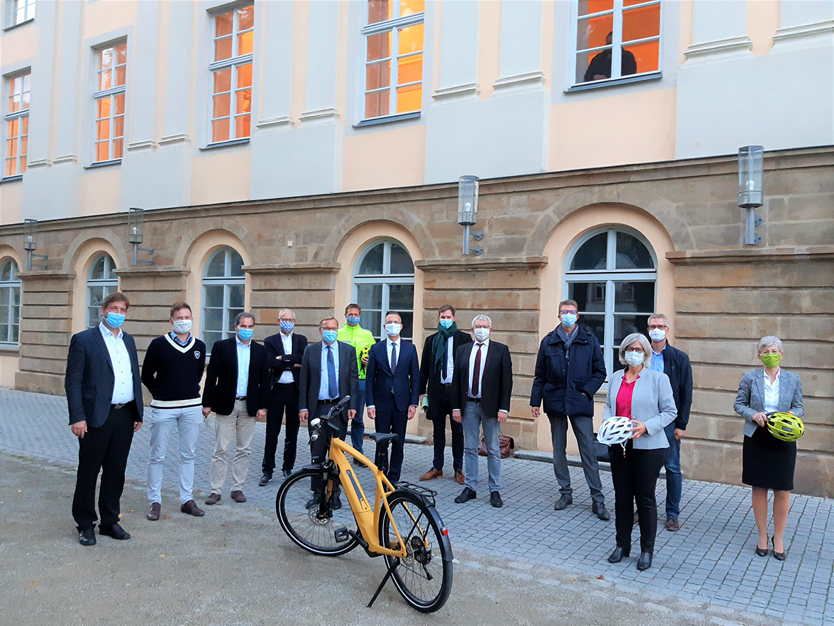 Die Teilnehmerinnen und Teilnehmer der KickOff-Veranstaltung „Radweg Bamberg-Nürnberg“ am 12. Oktober vor dem Tagungsort am Bamberger Theater. Mitten unter ihren Mitstreiterinnen und Mitstreitern als Fünfter von links, Bambergs Oberbürgermeister Andreas Starke, und als Fünfter von rechts, Landrat Johann Kalb, die die Federführung im Radweg-Projekt Bamberg-Nürnberg übernommen haben.