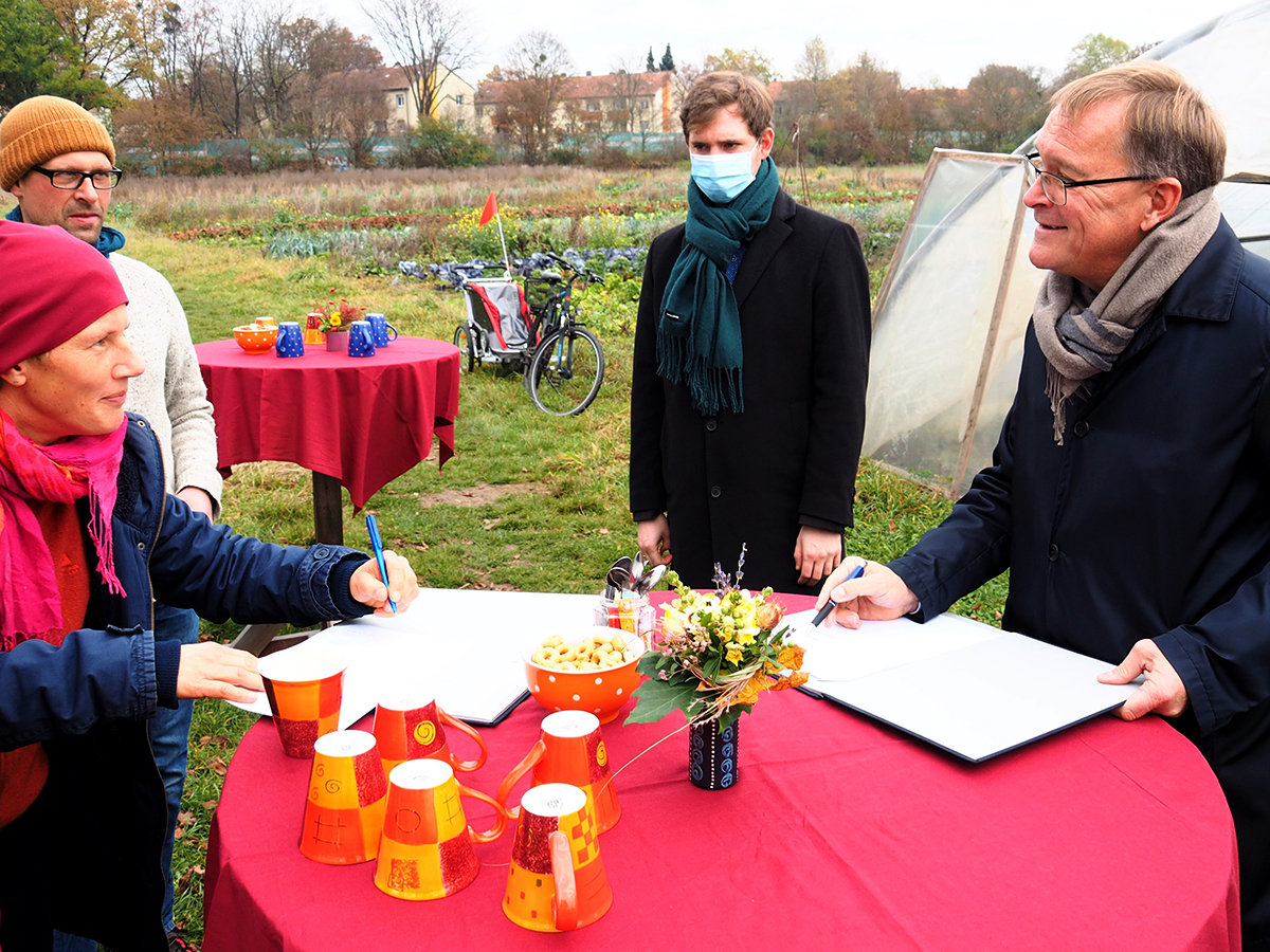 Vertreter der Solidarischen Landwirtschaft (Solawi) Bamberg kamen am 13. November mit Oberbürgermeister Andreas Starke, Bürgermeister Jonas Glüsenkamp und Wirtschaftsreferent Dr. Stefan Goller zusammen, um den Pachtvertrag für die neue Fläche der Solawi (Solidarische Landwirtschaft) in der Südflur zu unterzeichnen.