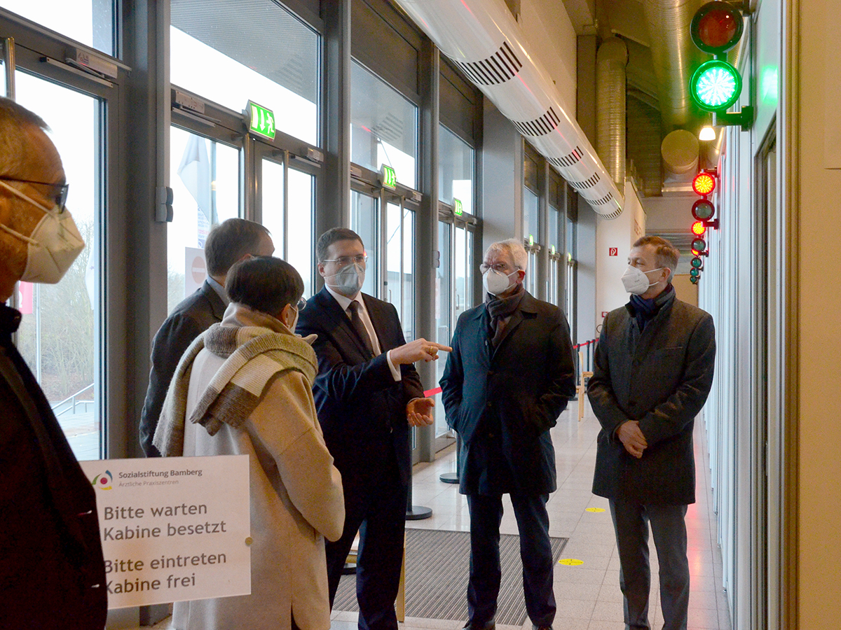 Zusammen mit Oberbürgermeister Andreas Starke, Landrat Johann Kalb wurde Heidrun Piwernetz von der Leitung der Sozialstiftung Bamberg und den Verantwortlichen für das Impfzentrum durch den hochmodern eingerichteten Komplex im Foyer der Brose Arena geführt, der in den vergangenen zwei Wochen installiert wurde. Oberbürgermeister Starke und Landrat Kalb zeigten sich, wie die Regierungspräsidentin, beeindruckt von der Organisation vor Ort: „Ich bin froh, dass wir uns für die Brose Arena als Standort entschieden haben, sie ist groß genug für alle Anforderungen des Impfzentrums und gut erreichbar. Jetzt kann der Impfstoff kommen – Bamberg ist bereit.“