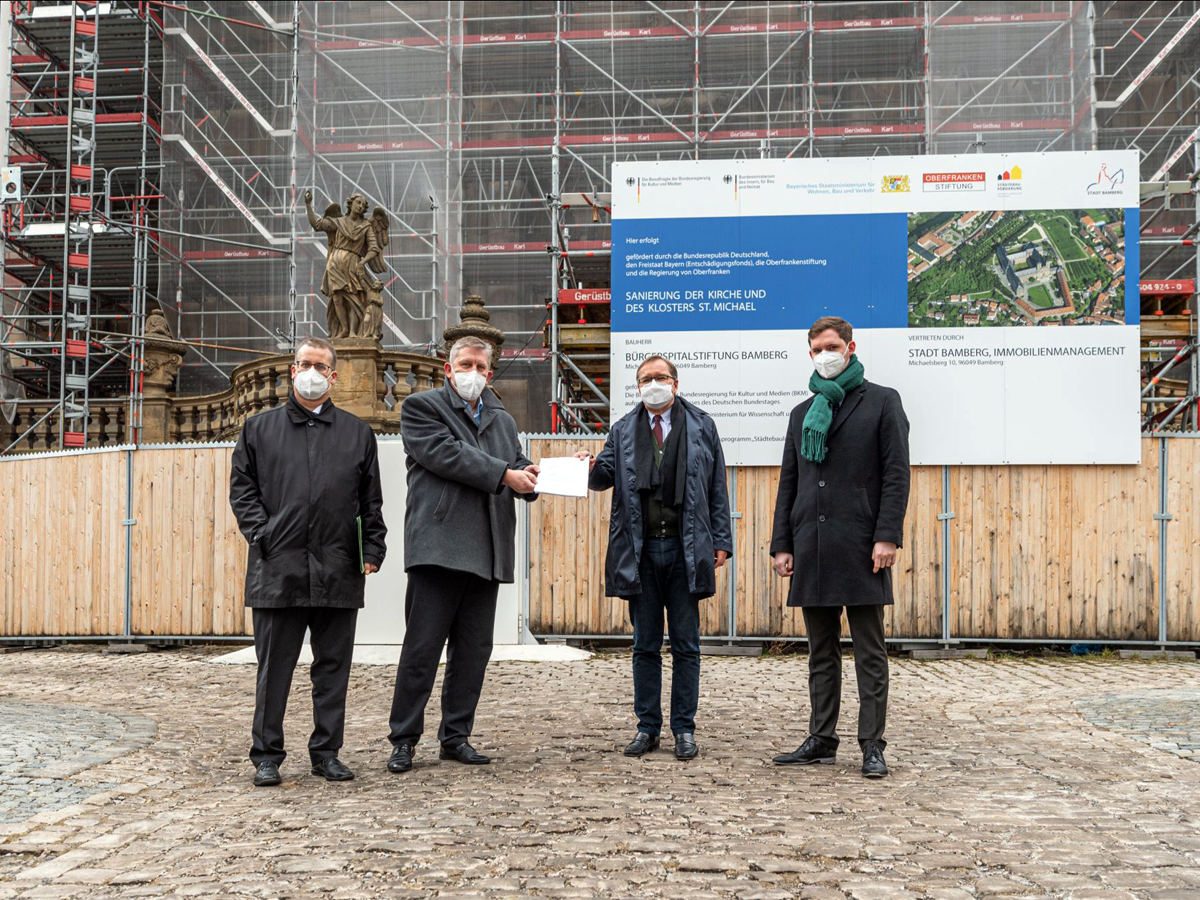 Bis 2030 soll die gesamte Klosteranlage nachhaltig und umfassend saniert sein. Als großes Zwischenziel wird nach heutiger Planung die Wiedereröffnung der Kirche Ende 2025 anvisiert, damit sie für Hochzeiten wieder genutzt werden kann. Der Bamberg-Forchheimer Bundestagsabgeordnete Andreas Schwarz überbrachte am Mittwoch, 10. März, bei einem Besuch auf dem Michaelsberg den Zuwendungsbescheid des Bundes in Höhe von bis zu 24 Millionen Euro an Oberbürgermeister Andreas Starke, Bürgermeister Jonas Glüsenkamp und den Finanz- und Stiftungsreferenten Bertram Felix.