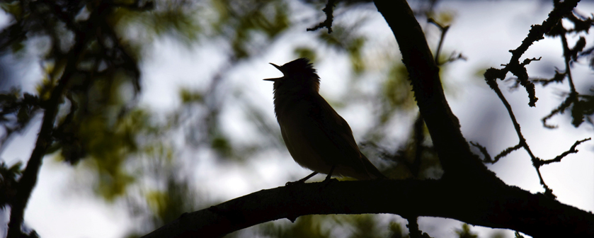 Bildunterschrift: Singende Nachtigall auf dem ERBA-Gelände, die während des Vogelkurses aus nächster Nähe beobachtet werden konnte.