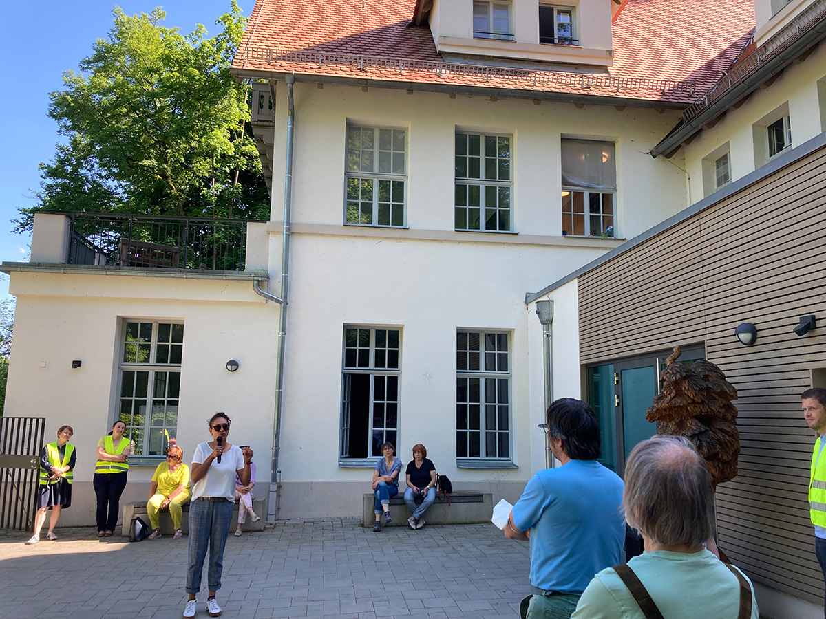 Die zweite Station führte die Teilnehmer:innen zur teuersten und höchstgelegenen Baustelle der Stadt. Am Michaelsberg fließen aktuell 80 Millionen Euro in die Generalsanierung der ehemaligen Klosterkirche und deren Außenanlagen. Auch hier berichtet Finanzreferent Felix detailreich vom Stand der Arbeiten insbesondere von der Kunstfertigkeit der hier tätigen Steinmetz-Meister und stellt die Wiederöffnung der Kirche im Jahr 2025 in Aussicht. Am Ende muss er sich selbst bremsen („Ich könnte ihnen Stunden und Tage über diese Baustelle etwas erzählen“), schließt dafür aber den Gästen unerwartet ein besonderes Tor auf: das Tor in den Garten der Villa Schröppel. Für das Gebäude wird aktuell ein Mieter gesucht. „Die Villa gehört der Bürgerspitalstiftung, deren Vermögen von der Stadt treuhänderisch verwaltet wird. Wir sind also gezwungen, hier einen guten Mietpreis für den Erhalt der Stiftung zu erzielen“, erklärt Felix den Zuhörer:innen, die über die Pracht der Immobilie staunen. „Dass wir in diesen Garten schauen konnten, fand ich extrem spannend“, sagt dann auch Teilnehmerin Claudia Popp.