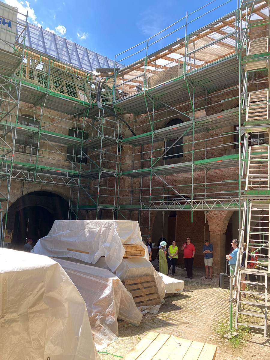 „Das war super heute, eine sehr schöne Tour“, ist Teilnehmerin Claudia Popp am Ende begeistert. Was ihr besonders gefallen hat? „Das Schloss Geyerswörth war ganz toll“, erhebt die Radlerin gleich die erste von vier Stationen mit Projekten der Städtebauförderung zum Höhepunkt der Tour. Mitten im komplett eingerüsteten Innenhof des Denkmals erzählt Finanzreferent Bertram Felix mit großer Sachkenntnis von der Geschichte des Schlosses und dessen Sanierung. Großen Eindruck hinterlässt auf Teilnehmer Wolf Strecker die Akribie, die hier bei der Renovierung des historischen Dachstuhls an den Tag gelegt wird: „Die verschiedenen Tests, die hier durchgeführt wurden, machen deutlich, dass es sich die Stadt nicht leicht macht mit diesen Maßnahmen, sondern dafür hohe Qualitätsmaßstäbe anlegt.“ Für die Ertüchtigung von Schloss Geyerswörth sind 21,9 Millionen Euro veranschlagt, aktuell liegt die Stadt laut Felix sogar rund eine Million günstiger. „Der Plan ist, dass wir bis Ende 2023 fertigwerden, aber angesichts der aktuellen Entwicklungen durch den Krieg in der Ukraine und der Rohstoffknappheit muss man abwarten, ob das zu halten ist“, erklärt der Finanzreferent auf Nachfrage.