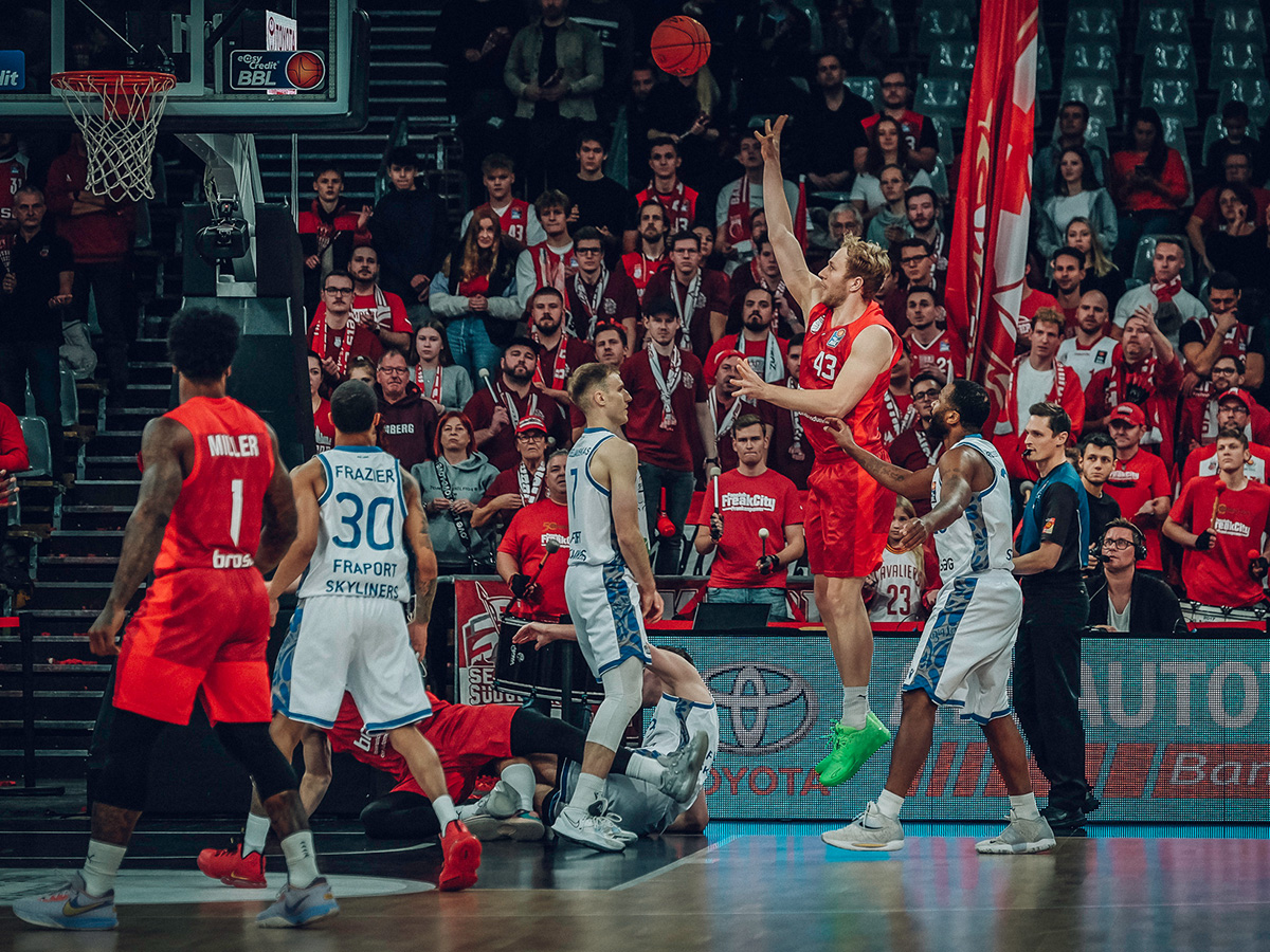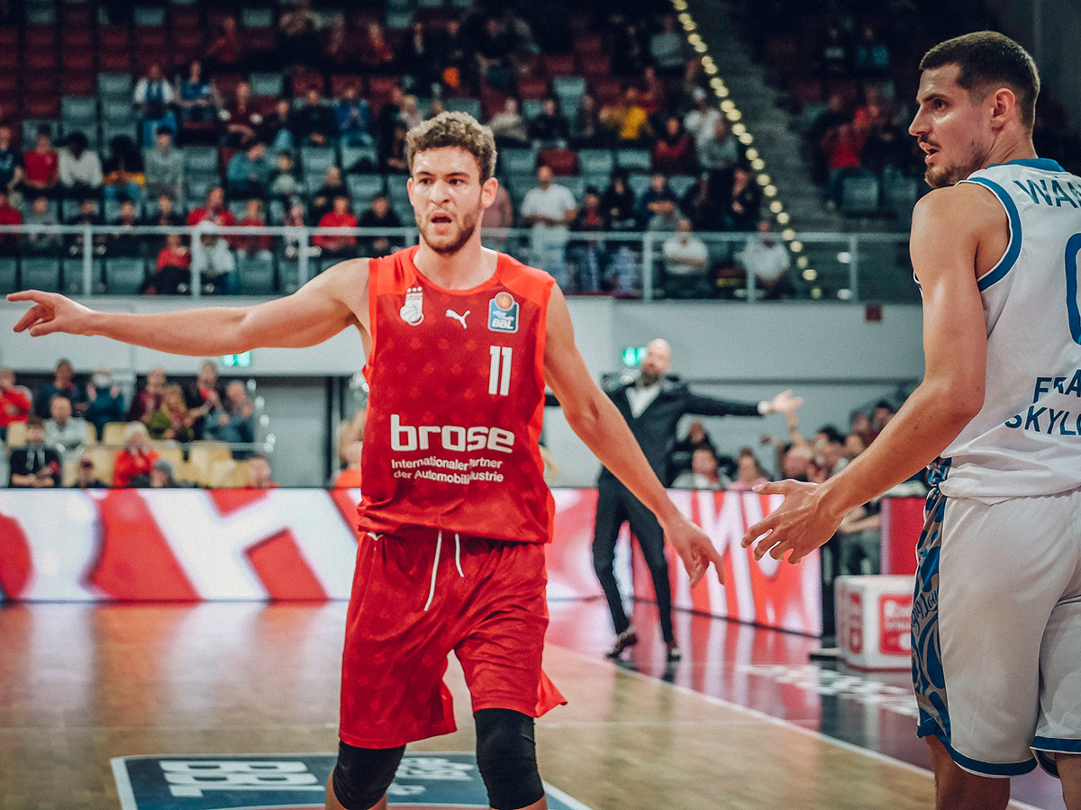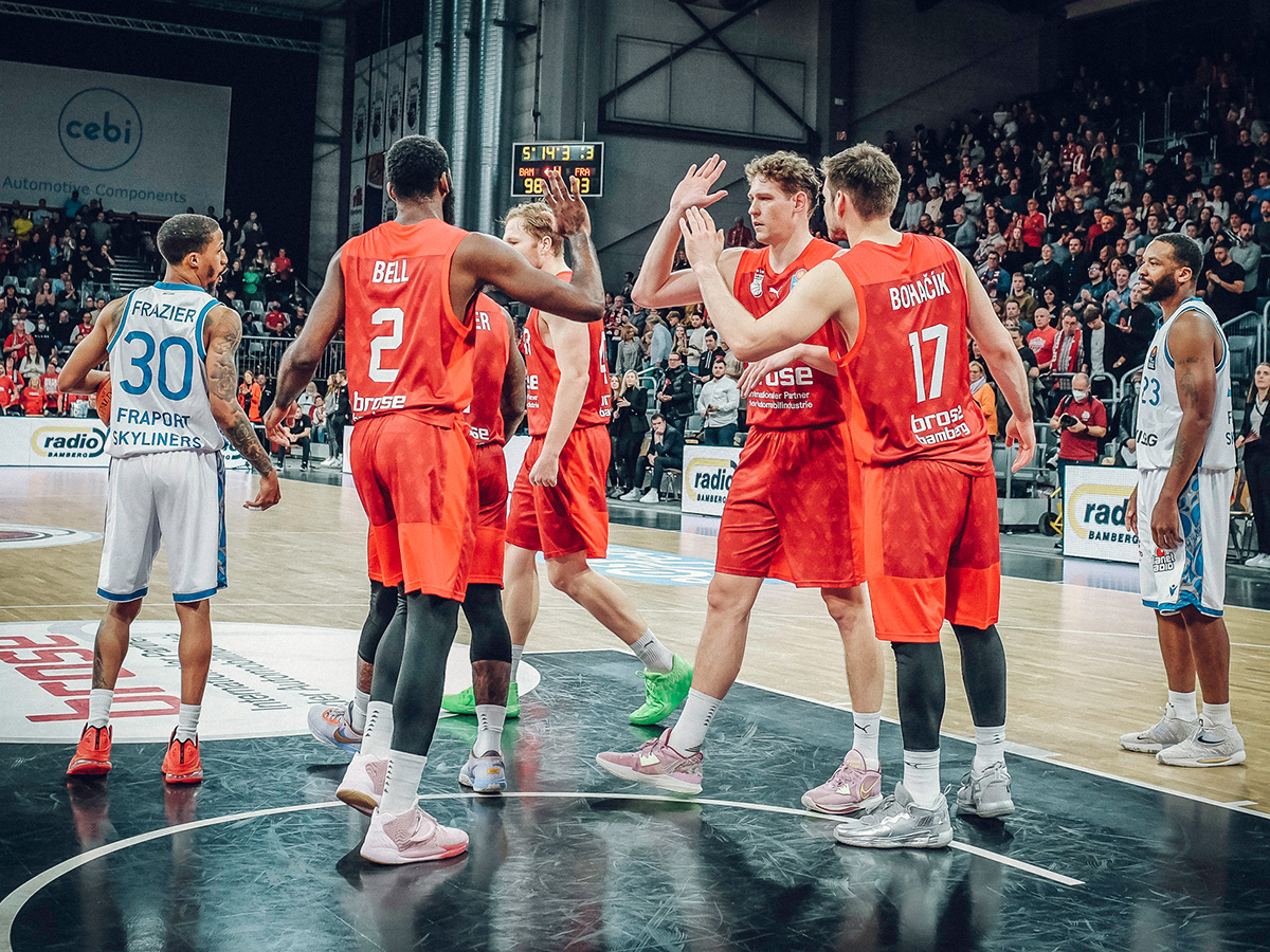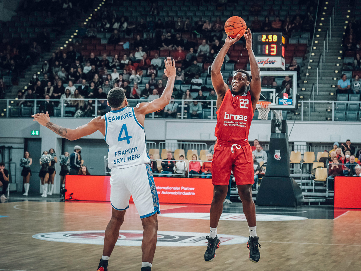 Brose Bamberg behielt am 7. Spieltag der easyCredit Basketball Bundesliga gegen die FRAPORT SKYLINERS mit 100:83 die Oberhand, holte sich somit den zweiten Sieg in Serie und gab die rote Laterne des Tabellenletzten an die Hessen ab. Nach einem ausgeglichenen ersten Viertel war es ein starkes zweites (32:15), das die Gastgeber vor 3.317 lautstarken Fans mit einem 21-Punkte-Vorsprung in die Pause gehen ließ: 57:36. Zwar kamen die Hessen in der zweiten Halbzeit etwas auf, auf weniger als acht Zähler schrumpfte die Bamberger Führung aber nie. Brose traf jeden zweiten seiner Dreierversuche (15/30), verteilte insgesamt 28 Assists und beherrschte den Rebound (39:23). Patrick Miller kam in seinem Debüt auf 13 Punkte, sieben Assists, drei Rebounds und drei Steals. Damit reihte er sich in ein starkes Kollektiv ein, in dem Christian Sengfelder mit 21 Zählern als bester Werfer hervorging.