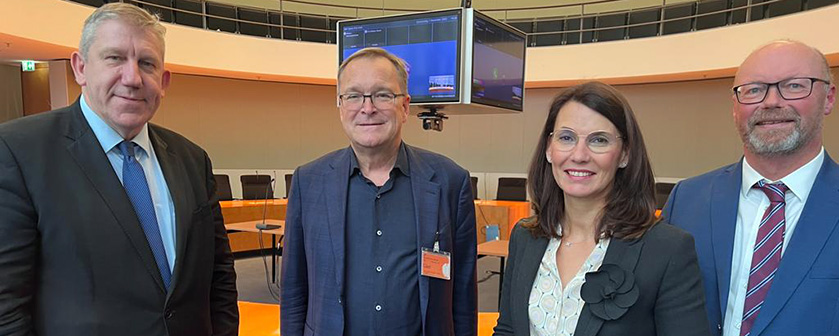 Bildunterschrift: Oberbürgermeister Andreas Starke (zweiter v.l.) tauschte sich gemeinsam mit MdB Andreas Schwarz (l.) mit der Parlamentarischen Staatssekretärin bei der Bundesinnenministerin des Inneren und für Heimat, Rita Schwarzelühr-Sutter, und ihren Mitarbeitern aus.