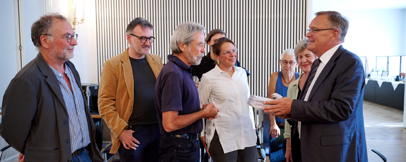 Für das Aktionsbündnis überreichte ihm Prof. Dr. Wolf Strecker 3071 Unterschriften, die in den vergangenen Wochen im Stadtgebiet gesammelt wurden. Die Unterzeichner erklärten sich mit den Forderungen des Bündnisses einverstanden, die unter anderem in der Michaelsberger Straße den Erhalt der gesunden Bäume und Ersatzpflanzungen mit klimarobusten Kastanien sowie eine Grünböschung mit Wildblumen und eine alternative Pflasterung der Böschung mit offenen Fugen fordern.
