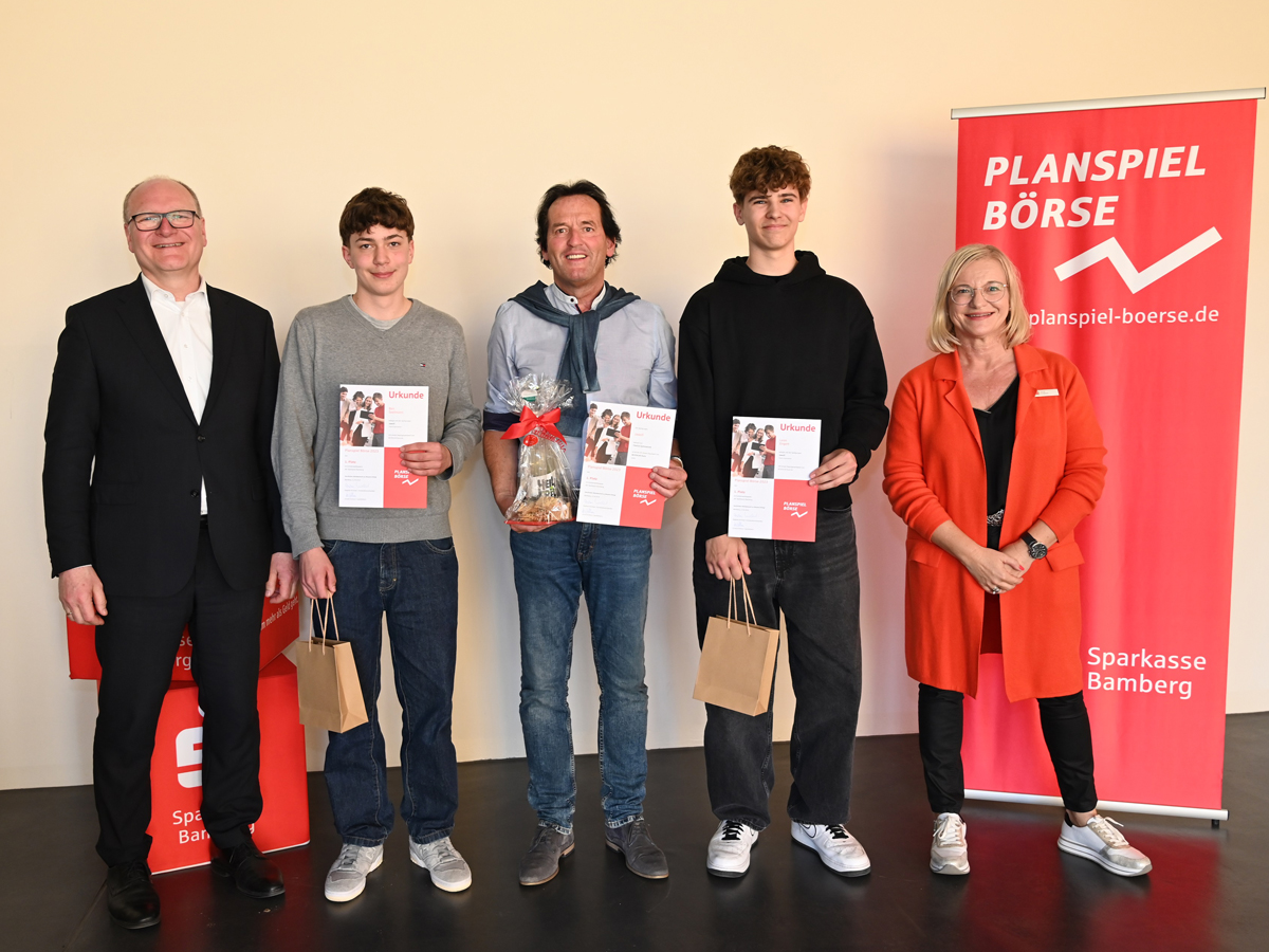 Die diesjährige Spielrunde war geprägt von einem Rekordhoch des DAX zum Jahresende, unterstützt von sinkenden Energiepreisen und der Hoffnung auf sinkende Zinsen. Beim Planspiel Börse werden nicht nur die Teams mit der höchsten Depotgesamtwertung, sondern auch die Teams mit den nachhaltigsten Geldanlagen prämiert. In der Depotgesamtwertung steigerte das Gewinnerteam „Jawoll“ vom Clavius-Gymnasium das Startkapital von 50.000 Euro auf 60.916,43 Euro. Die Sparkasse Bamberg prämiert den ersten Platz mit 300 Euro. In der Nachhaltigkeitsbewertung erwirtschaftete das Team „Bang-Street“ von der Graf-Stauffenberg- Wirtschaftsschule den höchsten Nachhaltigkeitsertrag mit 3.476,36 Euro. Das Team kann sich über 100 Euro freuen.