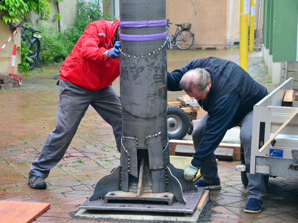 Das Kunstwerk besteht aus zehn historischen Gusseisensäulen der ehemaligen Jüdischen Nähseidenfabrik Kupfer, Heßlein & Co., die heute symbolisch für das aufstrebende jüdische Wirtschaftsleben stehen. Wagenhäuser hat diese Säulen in Plastiken aus Cortenstahl transformiert, die eine Schutzpatina entwickeln und sich mit der Zeit visuell verändern werden – ein Sinnbild für die fortlaufende Entwicklung und Deutung der Geschichte.