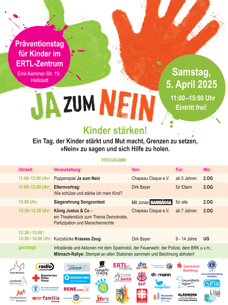 Die Veranstaltung wird von zahlreichen Expertinnen und Experten aus den Bereichen Kinderschutz, Jugendhilfe und Prävention unterstützt. „Kinder müssen wissen, wann sie Autoritätspersonen widersprechen dürfen, wo ihre Rechte liegen und wie sie im Notfall Hilfe holen können“, betont Maria Schuster, Leiterin der Bamberger Außenstelle des Weissen Ring e.V. Auch die Staatsanwaltschaft Bamberg ist als Initiatorin wieder mit an Bord. „Prävention ist eine gesamtgesellschaftliche Aufgabe, und Kinder sind dabei unser wichtigstes Gut“, hebt Leitender Oberstaatsanwalt Bernhard Lieb hervor. Peter König vom Lions Club Residenz als Hauptsponsor fasst zusammen: „Der Präventionstag ‚Ja zum Nein!‘ bietet eine wertvolle Möglichkeit, sich gemeinsam mit dem Thema Prävention auseinanderzusetzen, spielerisch zu lernen und wichtige Kontakte zu knüpfen. Seid dabei und helft mit, Kinder stark zu machen!“.