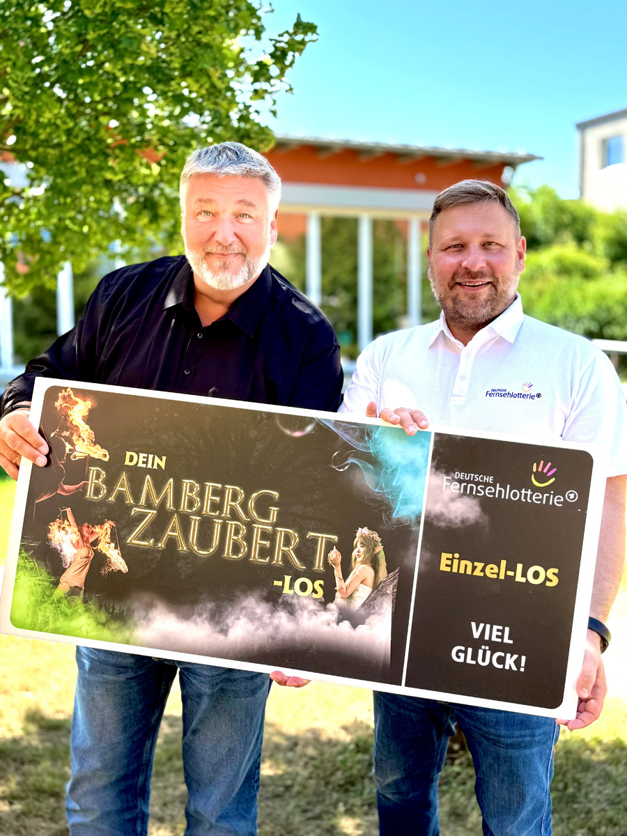 Bildunterschrift: v.l.n.r.: Klaus Stieringer, Geschäftsführer des Stadtmarketing Bamberg e.V. und Veranstalter des 25. Internationalen Straßen- & Varietéfestival `Bamberg zaubert´ & Stephan Masch, Repräsentant der DEUTSCHEN FERNSEHLOTTERIE gGmbH präsentieren das Bamberger `Zauber-LOS`