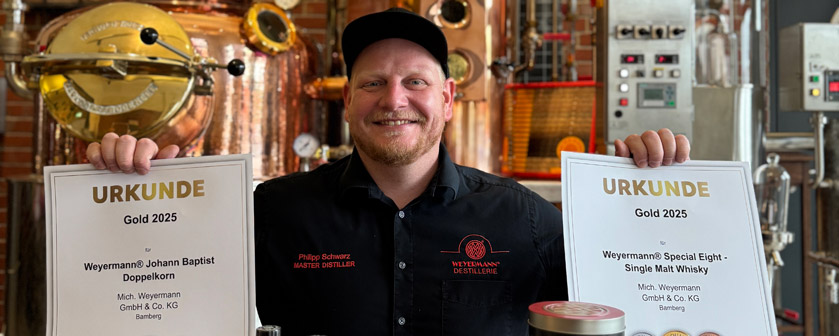 Hier wurden der Weyermann® Special 8 Single Malt Whisky sowie der Wahlsche Schnapsbirnenbrand im Akazienholzfass gereift jeweils mit Gold prämiert.
