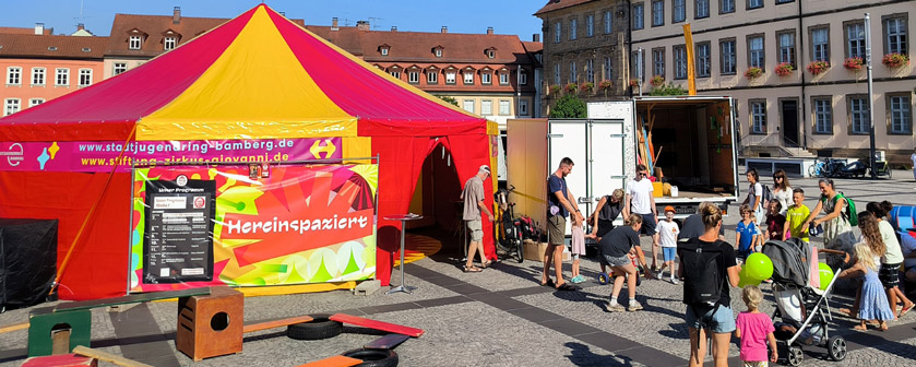 Das Projekt „Familienzelt am Maxplatz“ ist eine Idee der Stiftung Zirkus Giovanni und des Stadtjugendring Bamberg. Es soll dazu beitragen die Bamberger Innenstadt attraktiver zu machen. Mehr Infos und das komplette Programm gibt es unter: www.familienzelt-bamberg.de.
