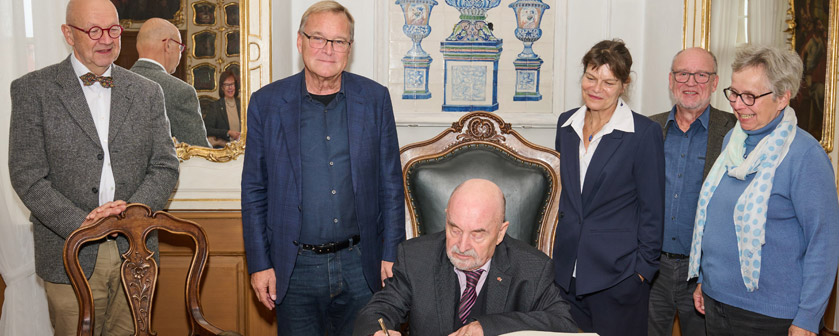 Bildunterschrift: Auf Einladung von Oberbürgermeister Andreas Starke trug sich Rainer Eppelmann im Rokoko-Saal des Alten Rathauses ins Goldene Buch der Stadt Bamberg ein.