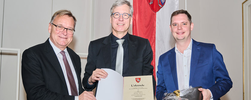 Bildunterschrift: Oberbürgermeister Andreas Starke (l.) sowie Bürgermeister und Personalreferent Jonas Glüsenkamp (r.) übergeben die Ruhestands-Urkunde an Thomas Beese.
