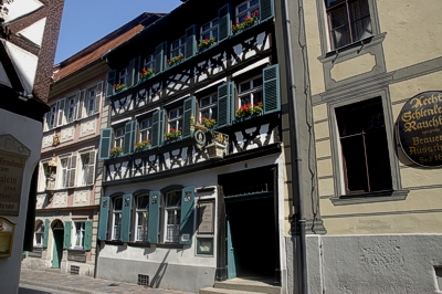 Bei der Schlenkerla Gaststätte ist ein Blick auf die Fachwerkfassade recht interessant und dabei besonders der Aushänger über dem Eingang.